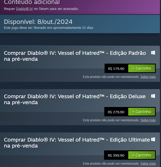 Isso tudo soa promissor, certo? Novos conteúdos geralmente adicionam mais qualidade de vida ao jogo. Porém, há um grande problema: todo esse novo conteúdo será vendido separadamente. O jogo base já é cobrado a um preço cheio, R$ 250, e a expansão Vessel of Hatred custará R$ 179,00.